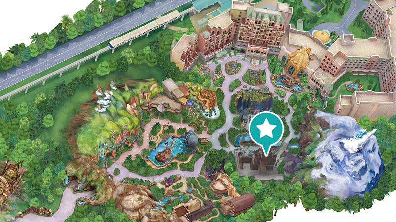 ファンタジースプリングスへ入って右方向へ道なりに進んでいくとアナ雪エリアだよ〜