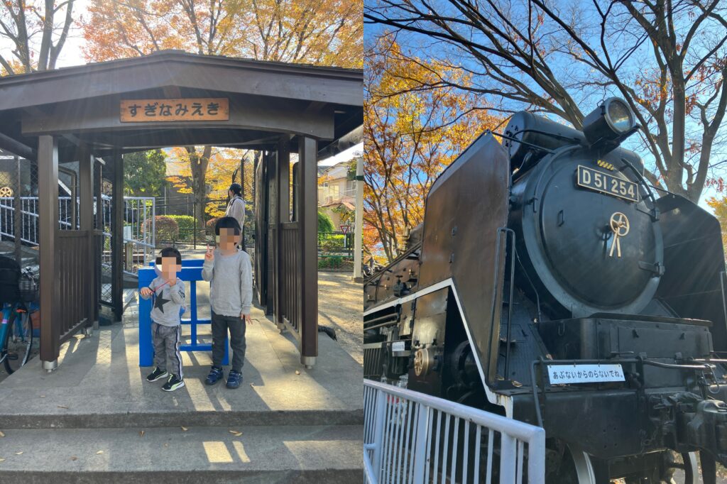 さらに、駐輪場の後ろには「すぎなみえき」と書かれた改札があり、奥には国鉄の大宮工場から運ばれた本物の蒸気機関車D51-254が展示されています。