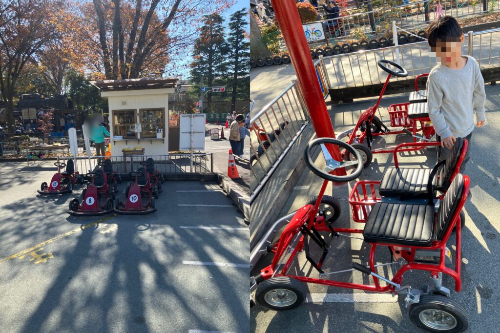 小学生以下の子は付き添い人(大人)と2人乗りできるゴーカートなら利用可。