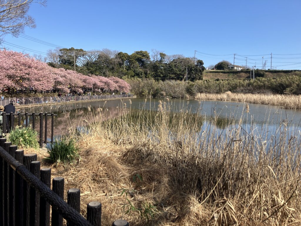 有名な河津桜と菜の花が並ぶ線路沿いの道は、この小松が池へ向かう道中にあります。