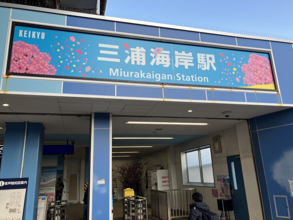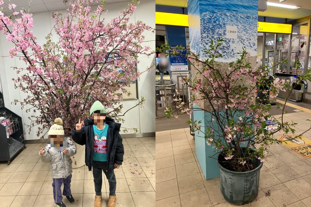 京急「三浦海岸」駅の改札内にも河津桜のフォトスポットがあり真っピンクのお出迎え。