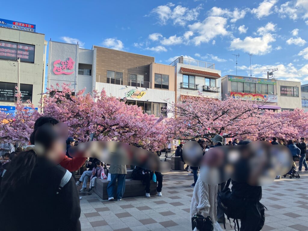 最寄りの京急三浦海岸駅を降りると、駅周辺からすでにピンク色の桜並木が拝めます。