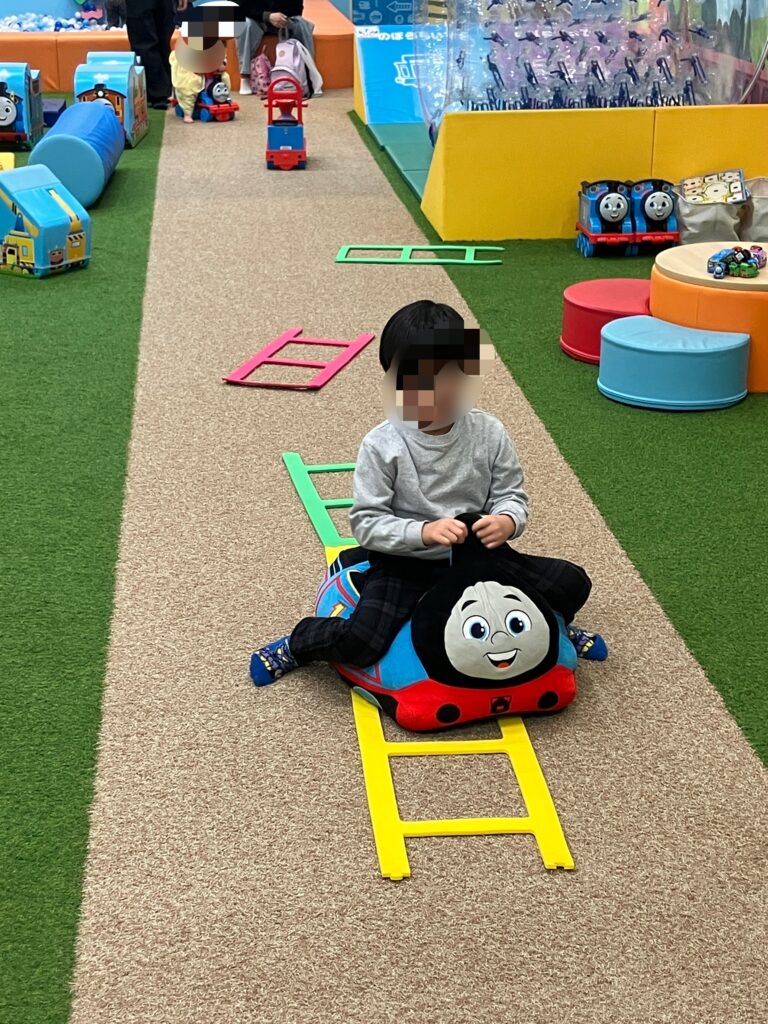 トーマスのおもちゃでじっくり遊べるエリアと、まったり休憩エリア、アクロバティックに身体を動かせるエリアがあります。